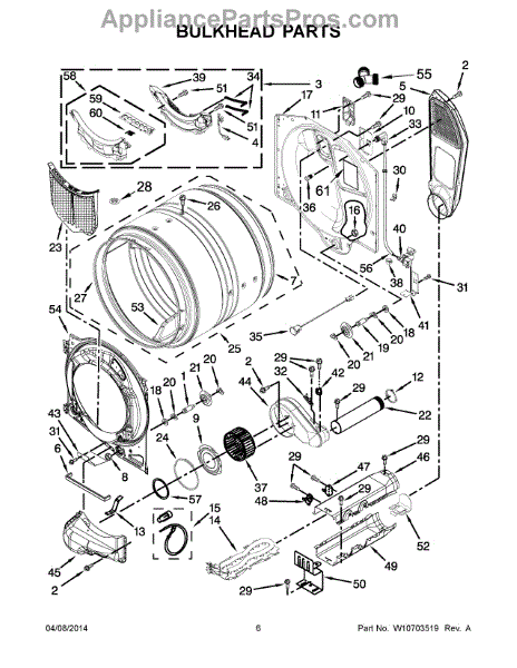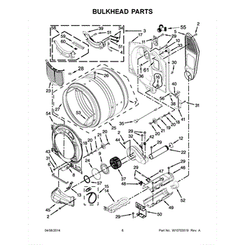 This bulkhead is the front structural panel that supports the dryer drum and seals the front of the cabinet to maintain proper airflow and drum alignment. Replacing a worn bulkhead restores stable drum rotation and prevents air leaks. What it does: