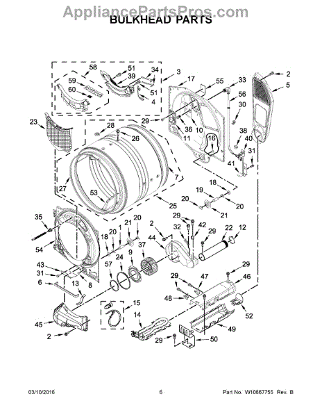 This bulkhead is the front structural panel that supports the dryer drum and seals the front of the cabinet to maintain proper airflow and drum alignment. Replacing a worn bulkhead restores stable drum rotation and prevents air leaks. What it does: