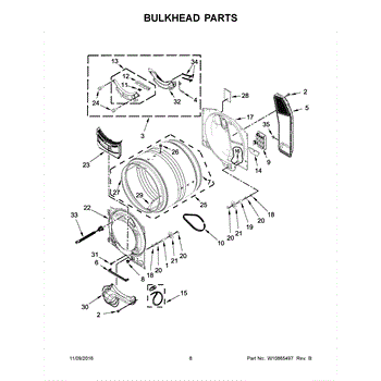 This bulkhead is the front structural panel that supports the dryer drum and seals the front of the cabinet to maintain proper airflow and drum alignment. Replacing a worn bulkhead restores stable drum rotation and prevents air leaks. What it does: