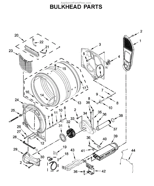 This bulkhead is the front structural panel that supports the dryer drum and seals the front of the cabinet to maintain proper airflow and drum alignment. Replacing a worn bulkhead restores stable drum rotation and prevents air leaks. What it does: