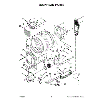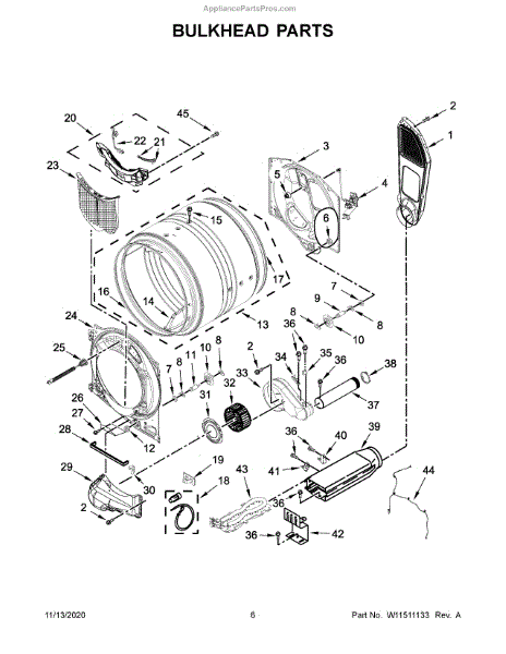 This bulkhead is the front structural panel that supports the dryer drum and seals the front of the cabinet to maintain proper airflow and drum alignment. Replacing a worn bulkhead restores stable drum rotation and prevents air leaks. What it does: