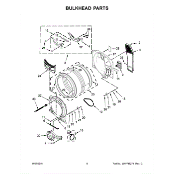 This bulkhead is the front structural panel that supports the dryer drum and seals the front of the cabinet to maintain proper airflow and drum alignment. Replacing a worn bulkhead restores stable drum rotation and prevents air leaks. What it does: