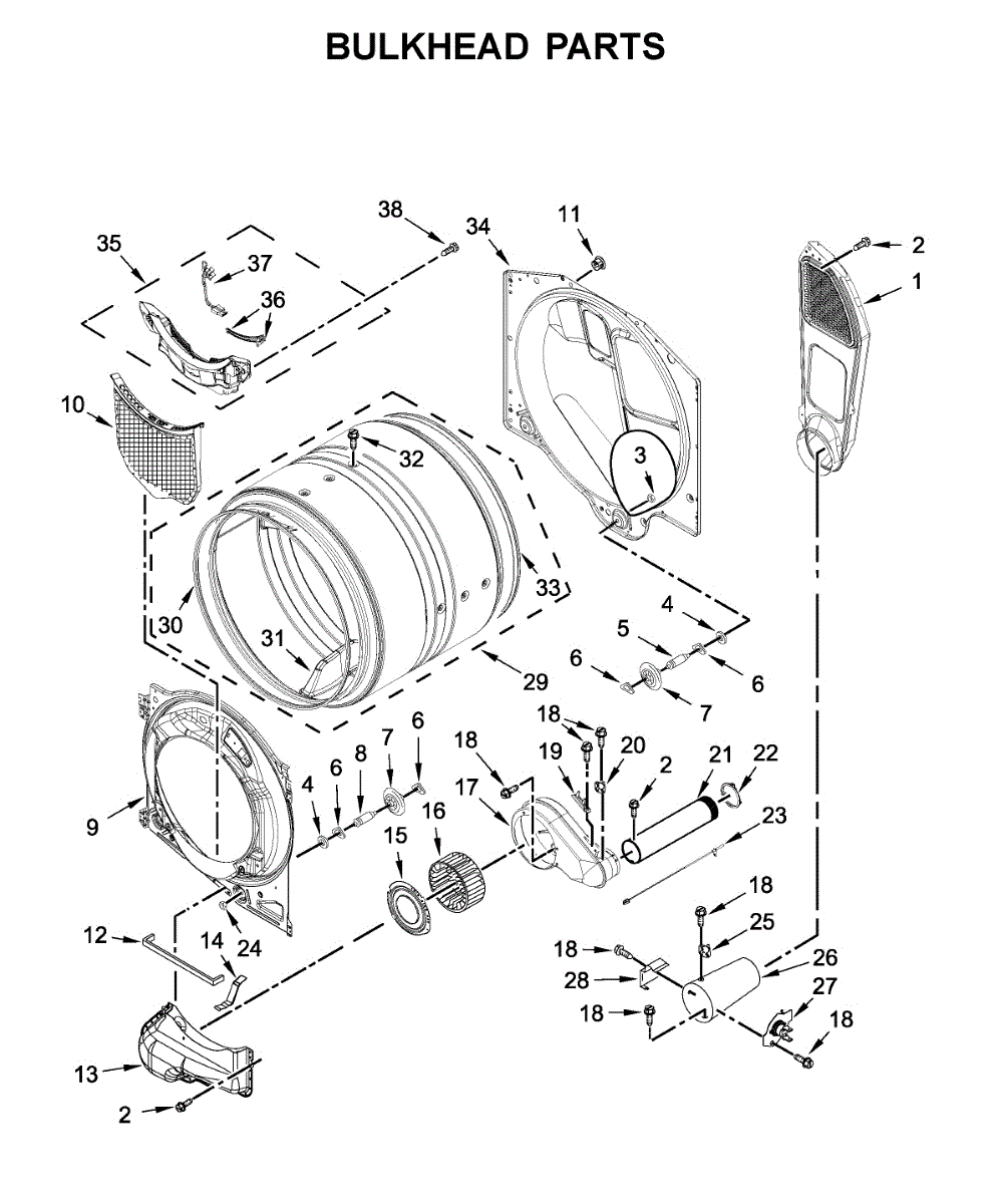 This bulkhead is the front interior panel that supports the drum and helps direct dryer airflow for efficient tumbling and exhaust. It restores proper drum alignment and airflow when the original panel is worn or damaged. What it does: