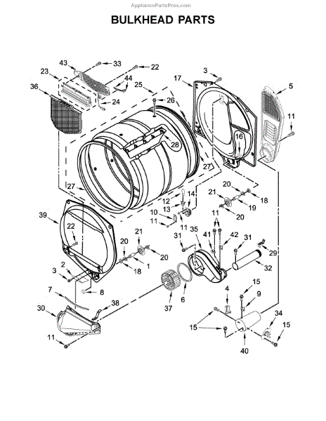 This front drum bulkhead is the stationary front panel that supports the dryer drum and seals the drum opening to maintain proper airflow and drum alignment for reliable drying performance. What it does: