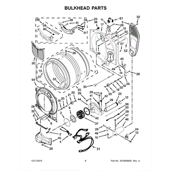 This bulkhead is the front structural panel that supports the dryer drum and seals the front of the cabinet to maintain proper airflow and drum alignment. Replacing a worn bulkhead restores stable drum rotation and prevents air leaks. What it does: