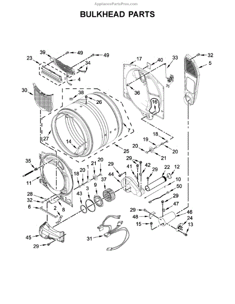 This bulkhead is the front structural panel that supports the dryer drum and seals the front of the cabinet to maintain proper airflow and drum alignment. Replacing a worn bulkhead restores stable drum rotation and prevents air leaks. What it does: