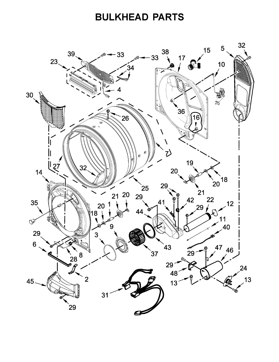 This bulkhead is the front structural panel that supports the dryer drum and seals the front of the cabinet to maintain proper airflow and drum alignment. Replacing a worn bulkhead restores stable drum rotation and prevents air leaks. What it does: