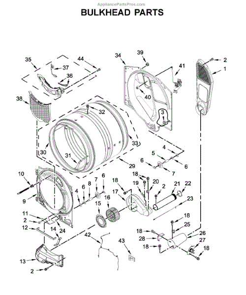 This bulkhead is the front structural panel that supports the dryer drum and seals the front of the cabinet to maintain proper airflow and drum alignment. Replacing a worn bulkhead restores stable drum rotation and prevents air leaks. What it does: