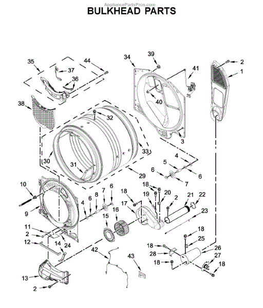 This bulkhead is the front structural panel that supports the dryer drum and seals the front of the cabinet to maintain proper airflow and drum alignment. Replacing a worn bulkhead restores stable drum rotation and prevents air leaks. What it does: