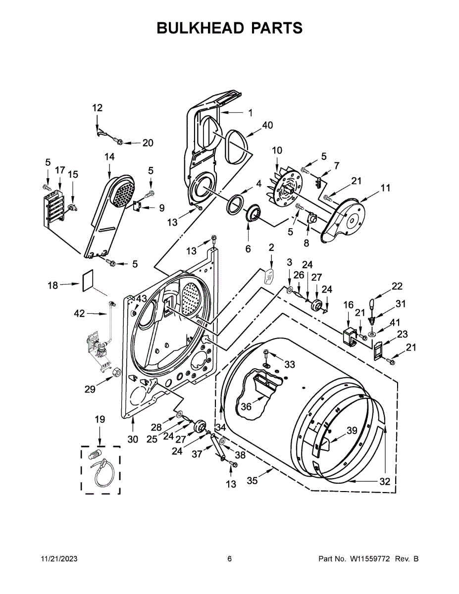 Replacement bulkhead that supports the front of the dryer drum and helps maintain correct drum alignment and airflow. Restores stable drum rotation and reduces rubbing, noise, and air leaks for more reliable drying performance. What it does:
