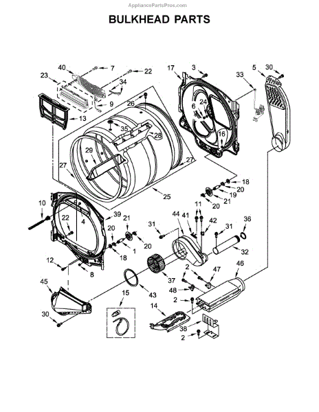 The Housing is an OEM component specifically designed for Whirlpool electric dryers. Found within the rear upper compartment, the square blower housing surrounds and supports the centrifugal fan assembly.