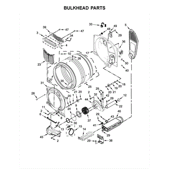 This bulkhead is the front structural panel that supports the dryer drum and seals the front of the cabinet to maintain proper airflow and drum alignment. Replacing a worn bulkhead restores stable drum rotation and prevents air leaks. What it does: