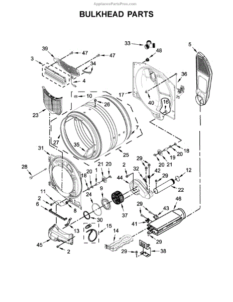 This bulkhead is the front structural panel that supports the dryer drum and seals the front of the cabinet to maintain proper airflow and drum alignment. Replacing a worn bulkhead restores stable drum rotation and prevents air leaks. What it does: