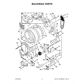 This bulkhead is the front structural panel that supports the dryer drum and seals the front of the cabinet to maintain proper airflow and drum alignment. Replacing a worn bulkhead restores stable drum rotation and prevents air leaks. What it does: