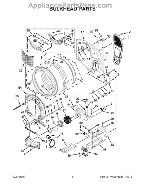 This bulkhead is the front structural panel that supports the dryer drum and seals the front of the cabinet to maintain proper airflow and drum alignment. Replacing a worn bulkhead restores stable drum rotation and prevents air leaks. What it does: