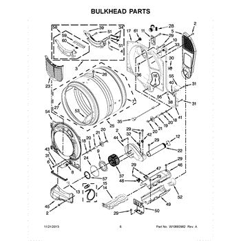 This bulkhead is the front structural panel that supports the dryer drum and seals the front of the cabinet to maintain proper airflow and drum alignment. Replacing a worn bulkhead restores stable drum rotation and prevents air leaks. What it does: