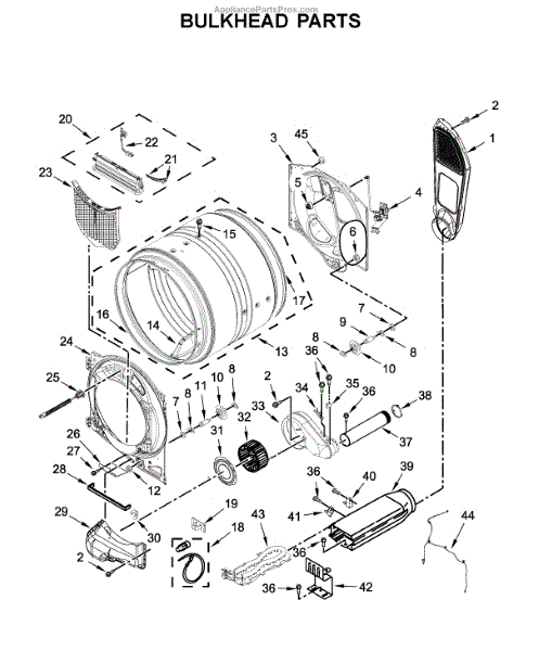 This bulkhead is the front structural panel that supports the dryer drum and seals the front of the cabinet to maintain proper airflow and drum alignment. Replacing a worn bulkhead restores stable drum rotation and prevents air leaks. What it does: