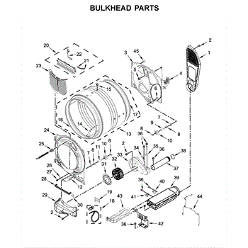 This bulkhead is the front structural panel that supports the dryer drum and seals the front of the cabinet to maintain proper airflow and drum alignment. Replacing a worn bulkhead restores stable drum rotation and prevents air leaks. What it does:
