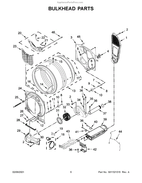 This bulkhead is the front structural panel that supports the dryer drum and seals the front of the cabinet to maintain proper airflow and drum alignment. Replacing a worn bulkhead restores stable drum rotation and prevents air leaks. What it does: