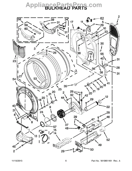 This bulkhead is the front structural panel that supports the dryer drum and seals the front of the cabinet to maintain proper airflow and drum alignment. Replacing a worn bulkhead restores stable drum rotation and prevents air leaks. What it does: