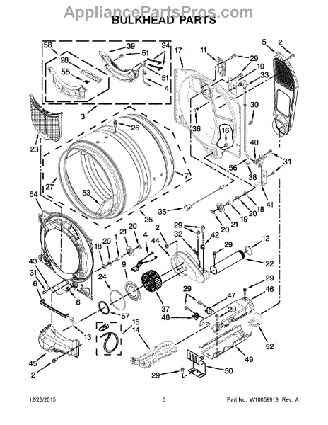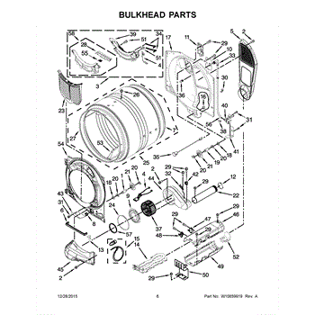 This bulkhead is the front structural panel that supports the dryer drum and seals the front of the cabinet to maintain proper airflow and drum alignment. Replacing a worn bulkhead restores stable drum rotation and prevents air leaks. What it does:
