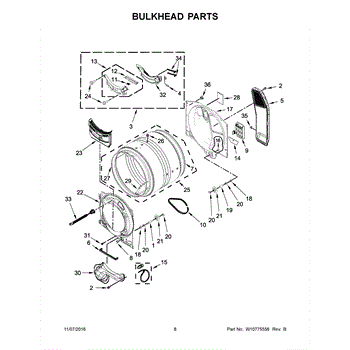 This bulkhead is the front structural panel that supports the dryer drum and seals the front of the cabinet to maintain proper airflow and drum alignment. Replacing a worn bulkhead restores stable drum rotation and prevents air leaks. What it does: