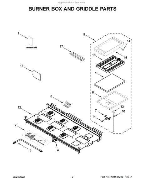 The Drip Tray is an OEM component designed specifically for Whirlpool ranges. Located underneath the range's bottom heating elements, the tray collects moisture, melted cheese, or other baked-on messes during cooking. Its indented surface area and angled drainage grooves route debris toward an easily removed drip cup.