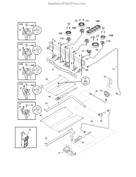 The Igniter Orifice Assembly is an OEM component for Frigidaire gas ranges. It is an integrated assembly housing both the electric ignition wire and adjustable gas orifice or restrictor needed for controlled gas flow. Symptoms of a bad ignitor orifice assembly include: