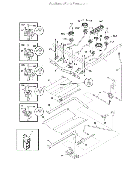 The Igniter Orifice Assembly is an OEM component for Frigidaire gas ranges. It is an integrated assembly housing both the electric ignition wire and adjustable gas orifice or restrictor needed for controlled gas flow. Symptoms of a bad ignitor orifice assembly include: