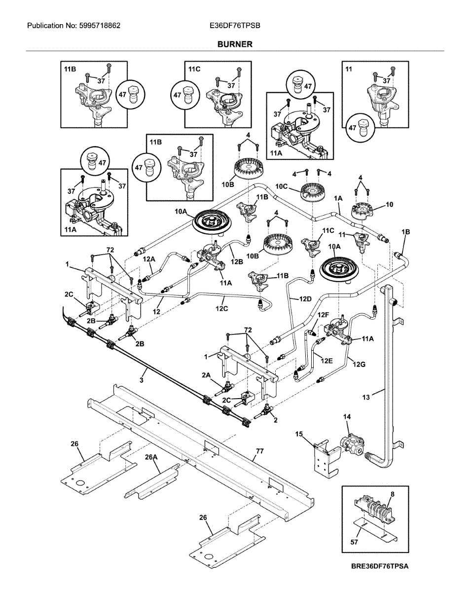 Replacement gas burner for ranges and cooktops. Restores even flame distribution when original is clogged, damaged, or worn from boilovers and daily use.