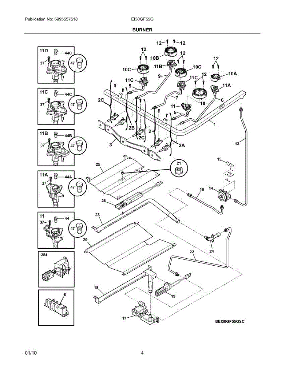 Combines spark igniter electrode with orifice holder for gas surface burners. Replace when cracked, broken, or no longer securely holding components in place.