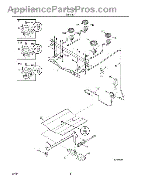 Igniter and orifice assembly includes igniter, orifice, and gas tube. Replace if cracked, corroded, or broken. Installs under range top at burner base.