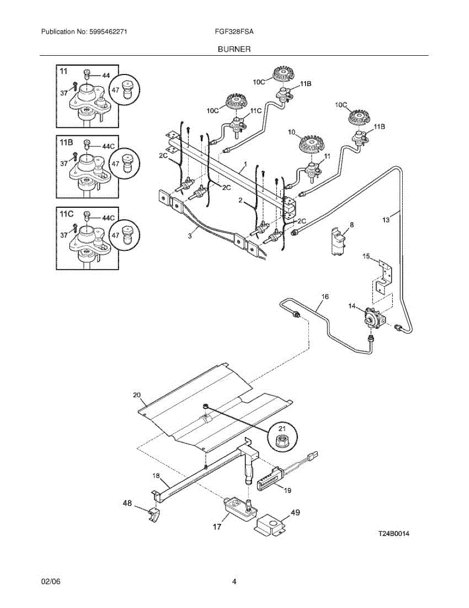 Igniter and orifice assembly for gas range burners. Includes igniter, orifice, and gas tube. Replace if cracked, broken, or when burner sparks incorrectly.