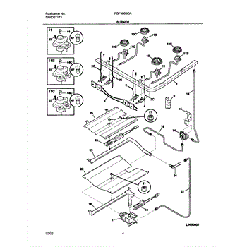 Igniter and orifice assembly includes igniter, orifice, and gas tube. Replace if cracked, corroded, or broken. Installs under range top at burner base.