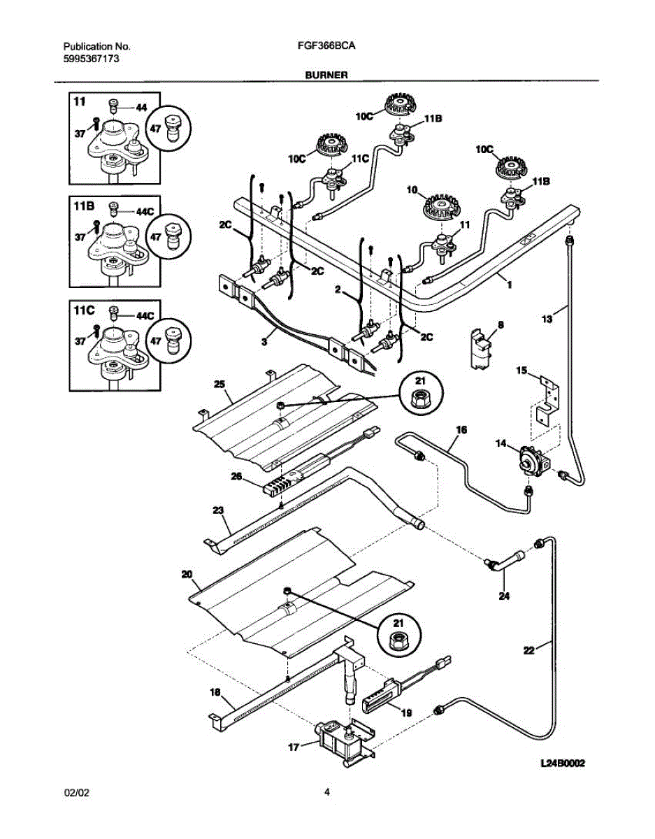 Igniter and orifice assembly for gas range burners. Includes igniter, orifice, and gas tube. Replace if cracked, broken, or when burner sparks incorrectly.