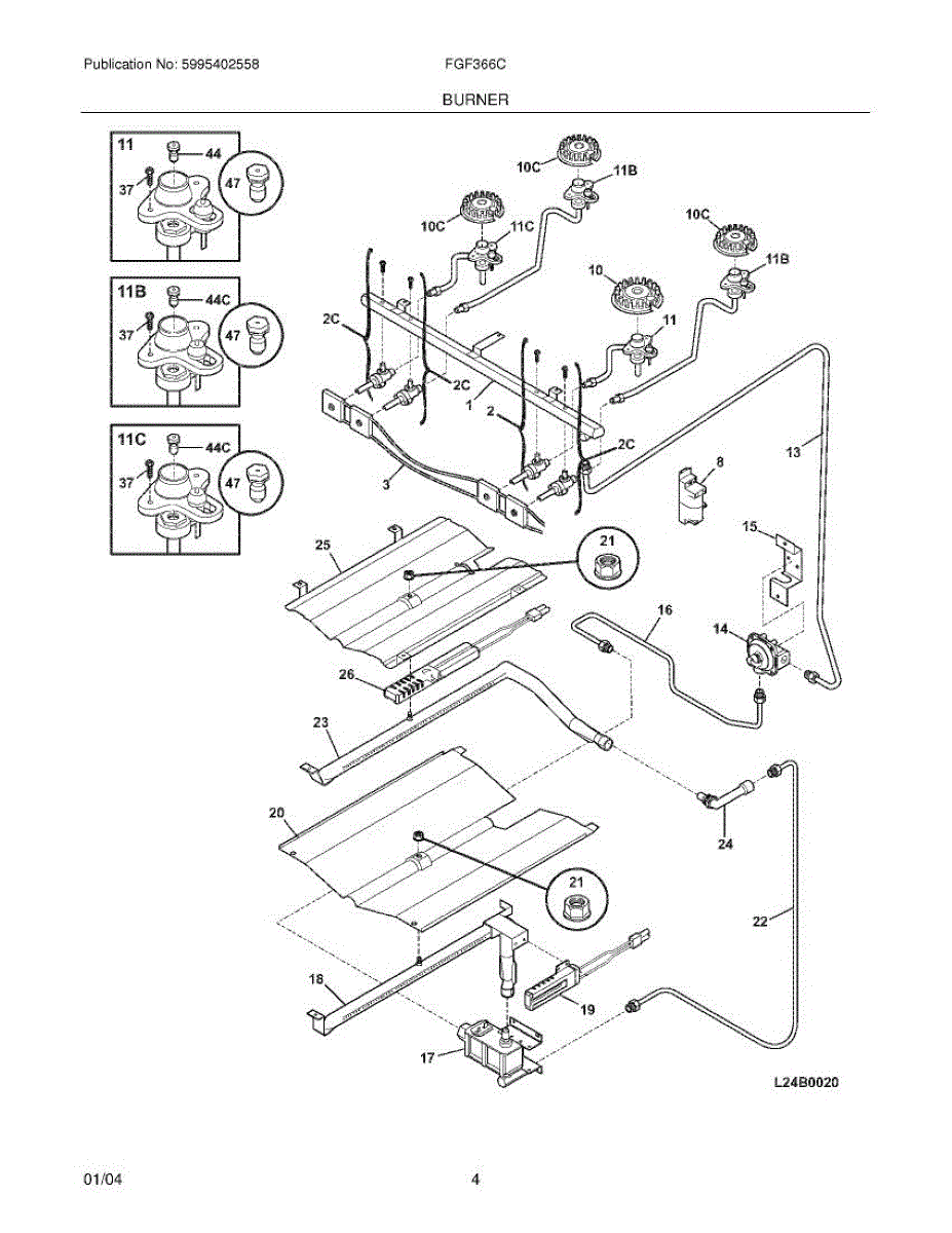Igniter and orifice assembly includes igniter, orifice, and gas tube. Replace if cracked, corroded, or broken. Installs under range top at burner base.