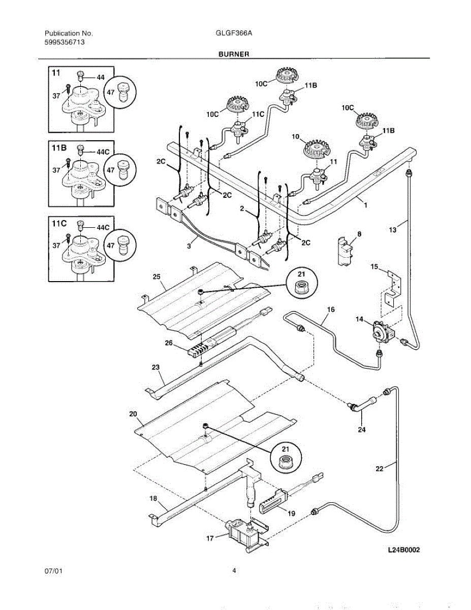 Igniter and orifice assembly for gas range burners. Includes igniter, orifice, and gas tube. Replace if cracked, broken, or when burner sparks incorrectly.