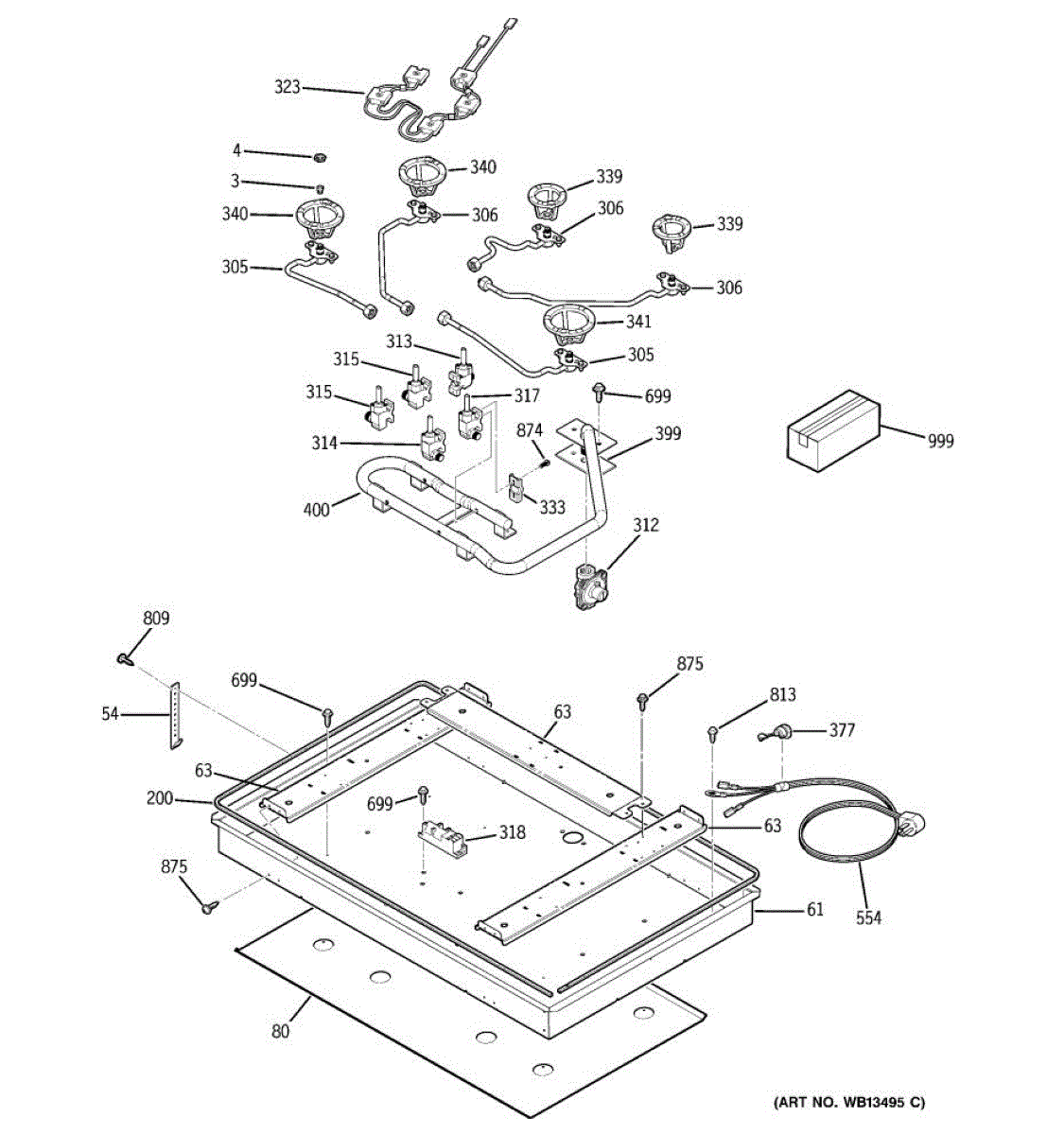 Center gas tube assembly for cooktop burners. Directs gas from manifold to center burner. Replace if damaged, clogged, or worn for proper flame distribution.