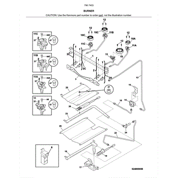 This surface burner ignitor/orifice assembly directs gas through a calibrated orifice and provides the spark to ignite it. Replacing a worn or damaged assembly restores consistent lighting and an even flame on the affected rangetop burner.