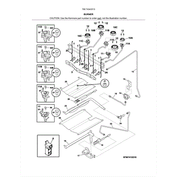 This surface burner ignitor/orifice assembly directs gas through a calibrated orifice and provides the spark to ignite it. Replacing a worn or damaged assembly restores consistent lighting and an even flame on the affected rangetop burner.