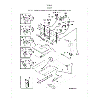 This surface burner ignitor/orifice assembly directs gas through a calibrated orifice and provides the spark to ignite it. Replacing a worn or damaged assembly restores consistent lighting and an even flame on the affected rangetop burner.