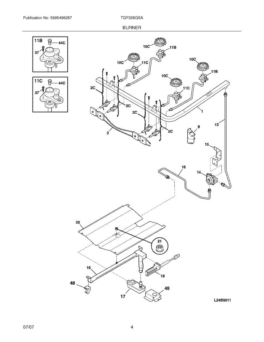 Igniter and orifice assembly includes igniter, orifice, and gas tube. Replace if cracked, corroded, or broken. Installs under range top at burner base.