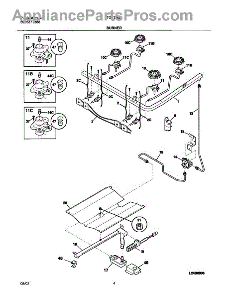 Igniter and orifice assembly includes igniter, orifice, and gas tube. Replace if cracked, corroded, or broken. Installs under range top at burner base.