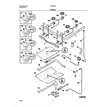 Igniter and orifice assembly includes igniter, orifice, and gas tube. Replace if cracked, corroded, or broken. Installs under range top at burner base.