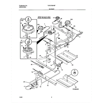 This burner mounting screw fastens the surface burner assembly to its base on the cooktop, keeping it stable and properly aligned. Replace stripped, rusted, or missing screws to eliminate wobble and maintain even flame positioning.