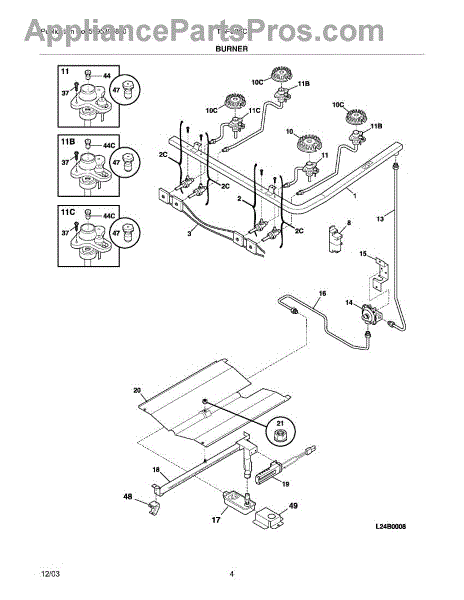 Igniter and orifice assembly includes igniter, orifice, and gas tube. Replace if cracked, corroded, or broken. Installs under range top at burner base.