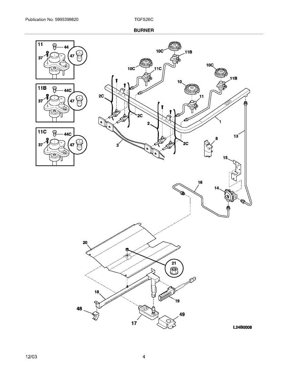Igniter and orifice assembly for gas range burners. Includes igniter, orifice, and gas tube. Replace if cracked, broken, or when burner sparks incorrectly.