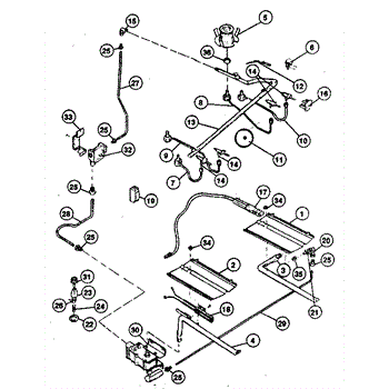 Pressure regulator for gas ranges. Controls gas flow from supply line to burners and oven. Replace if worn, damaged, or causing pressure issues.