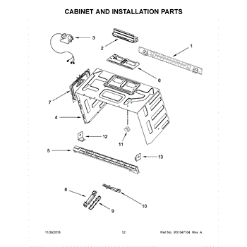 The Upper Cabinet Template is an OEM part for Whirlpool microwaves. This template is used during the installation of the microwave to ensure correct placement and alignment within the upper cabinet, providing guidance for drilling holes and securing the microwave in place.