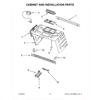 The Upper Cabinet Template is an OEM part for Whirlpool microwaves. This template is used during the installation of the microwave to ensure correct placement and alignment within the upper cabinet, providing guidance for drilling holes and securing the microwave in place.